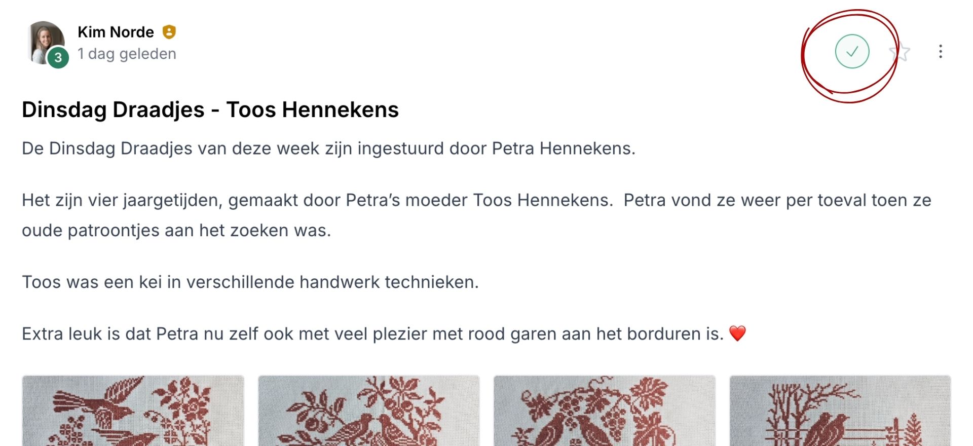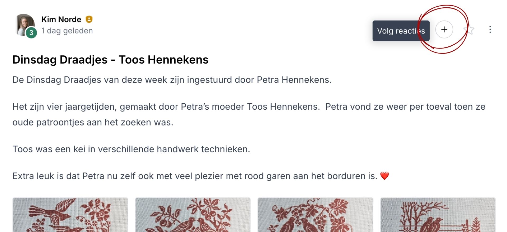 Als je het plusje aanklikt, zie je dat er een vinkje verschijnt. Je krijgt nu melding als er een reactie wordt geplaatst op dit bericht.