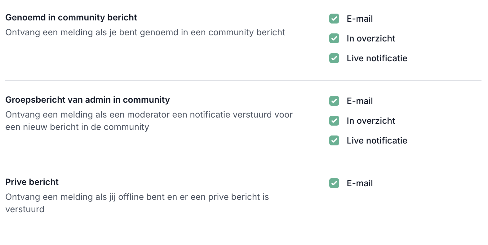 Je kunt bovendien ook kiezen hoe je meldingen wil ontvangen. Hiervoor klik je in de Soed Idee Club linksonderaan op je profielfoto en vervolgens op 'notificaties'. Onderstaand scherm verschijnt waarop je kunt aangeven hoe je meldingen wil ontvangen: